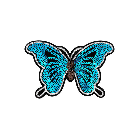 Producto: Parche (5 Unidades) • Diseño: Mariposa celeste • Material: Lentejuelas Bordadas • Tamaño: 11 Cm de Ancho X 7 Cm de Alto • Adhesión: Incluye Capa Termoadhesiva. Listo para Pegar con Plancha Térmica o Plancha Casera • Uso: Personalización de Poleras, Chaquetas, Vestidos, Bodies, Bolsos