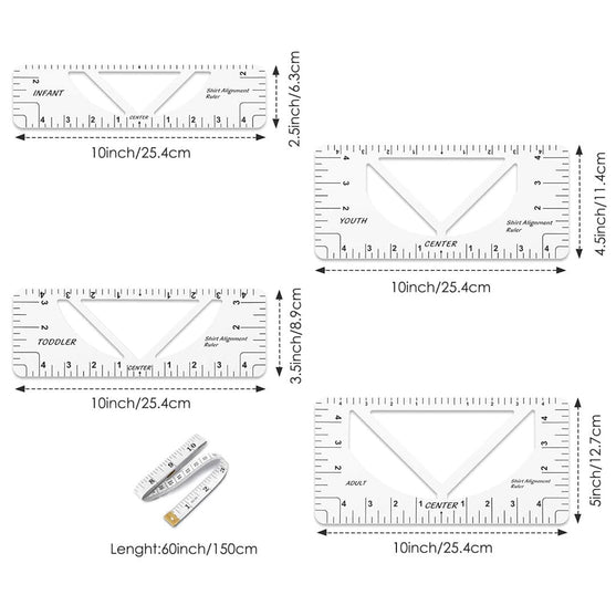 Producto: Reglas Guía (5 Unidades) • Material: Pvc • Tamaño: Tamaño A: 25.4 Cm de Ancho X 6.3 Cm de Alto, Tamaño B: 25.4 Cm de Ancho X 11.4 Cm de Alto, Tamaño C: 25.4 Cm de Ancho X 8.9 Cm de Alto, Tamaño D: 25.4 Cm de Ancho X 12.7 Cm de Alto, Tamaño E 150 Cm Longitud • Uso: Alineación y Centrado de Parches y Apliques en el Proceso de Adhesión en Poleras, Vestidos, Poleranes, Chaquetas • Color: Blanco